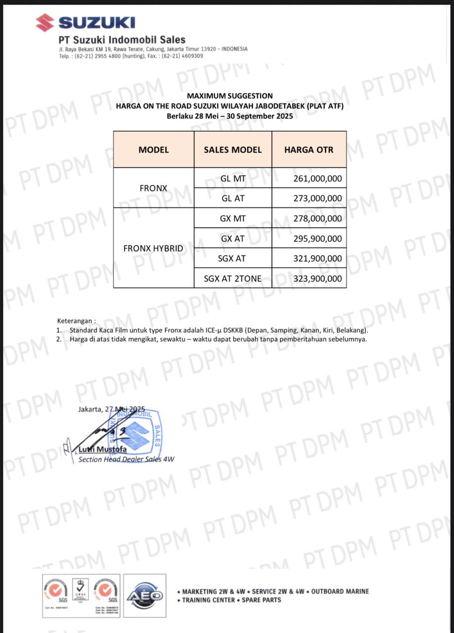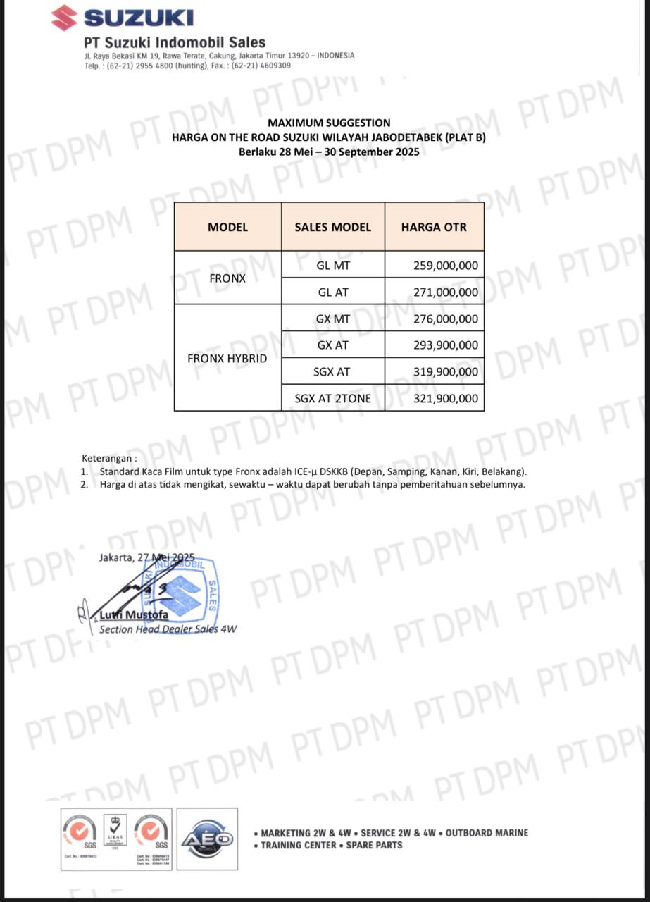 Temukan Keunggulan Suzuki di Dealer Resmi Kami! Dapatkan penawaran terbaik dan pelayanan prima untuk setiap pembelian mobil Suzuki. Hubungi Hafiz sekarang dan bawa pulang mobil impian Anda dengan mudah dan cepat. Suzuki - Menginspirasi Perjalanan Anda.
